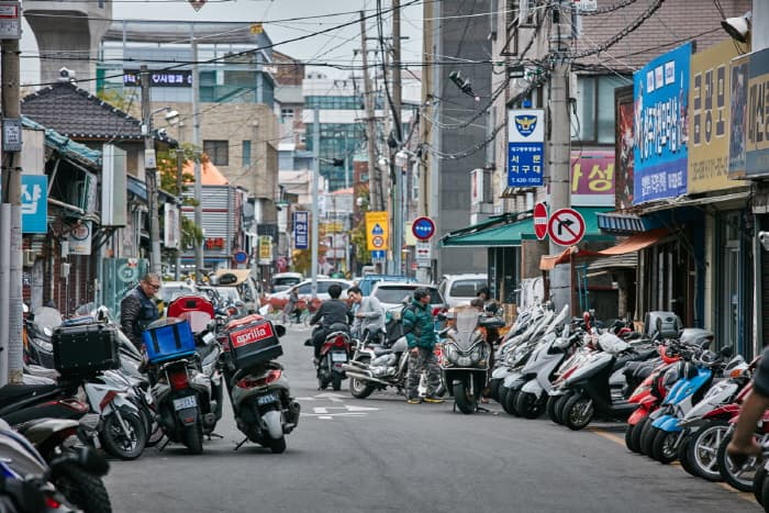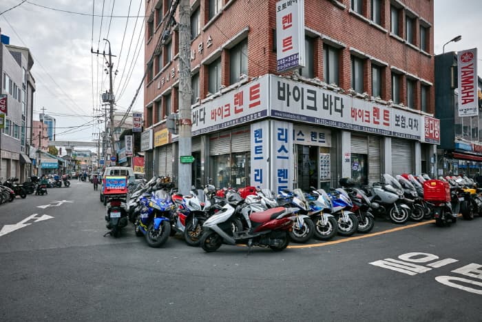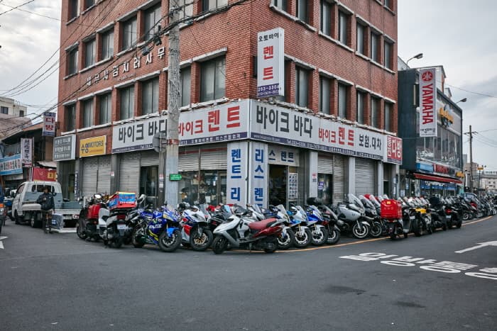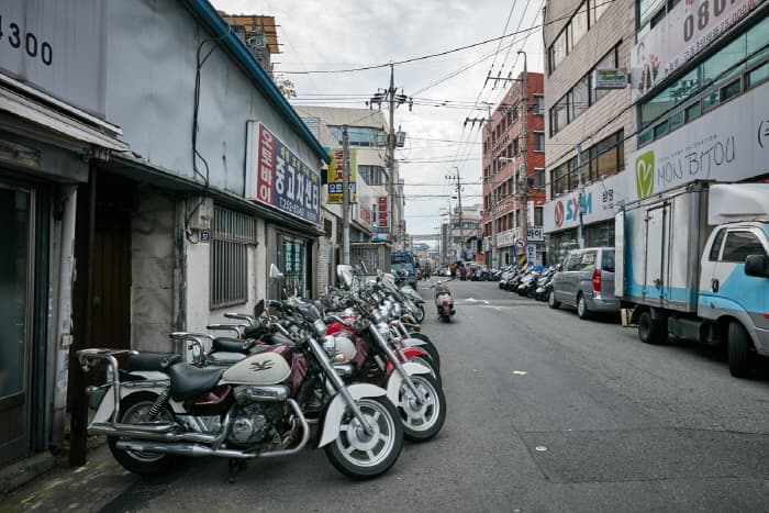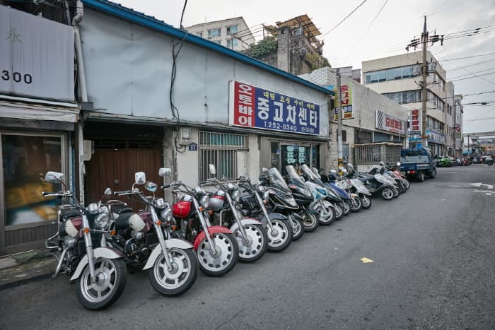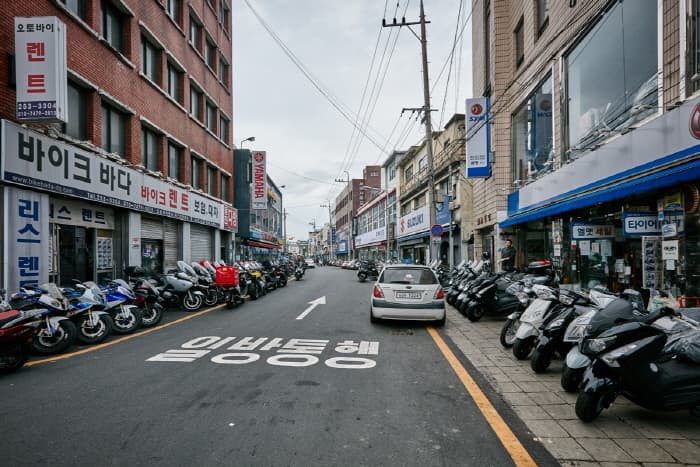 Daegu Motorcycle Street is located in Ingyo-dong, Jung-gu, Daegu along Sijangbuk-ro. The street was originally a creek lined with houses, but in 1953 the creek was covered over and made into a paved road. Gas stations and stores selling automotive parts sprung up, turning the area into a thriving commercial district. In 1961, the first motorcycle store opened its doors and was quickly followed by several more.