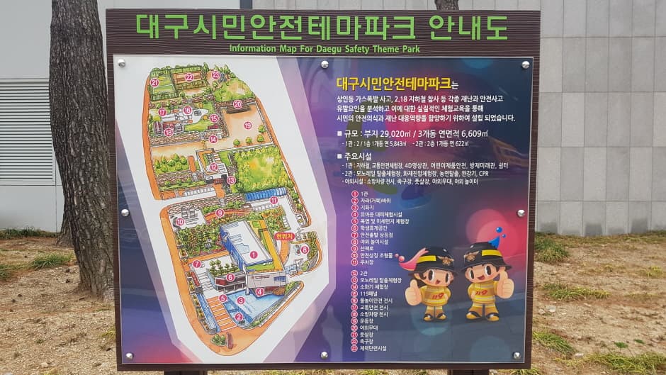Daegu Safety Theme Park was established to provide citizens with education on safety measures in an emergency situation. The theme park has experience stations set up to demonstrate accidents one can encounter in their everyday life and provides an opportunity to exercise simulated safety drills. Noteworthy exhibition halls that provide practical and useful safety information include the Subway Safety Exhibition, Mountain Safety Exhibition, and Earthquake Safety Exhibition. All of the facilities throughout the park, including the exhibition halls and the safety education theater, are designed to emphasize the importance of safety.