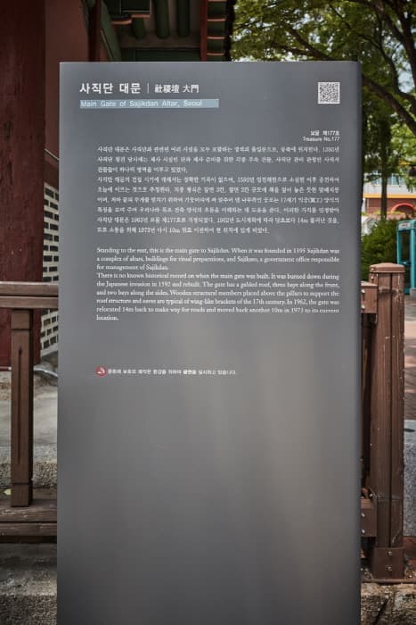 The name of the park dates back to 1395 when Taejo Yi Sung-gye made Sajik Altar (altar to the State deities) at the center of the park. "Sa" refers to the deity of the earth while "jik" refers to the deity of the five grains. Rites wishing for a good harvest were held regularly at Sajik Altar.