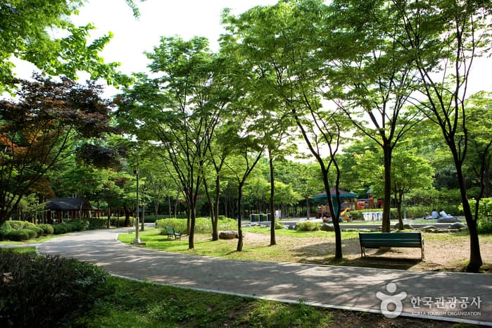 Amenities and facilities include an outdoor wedding hall, walking course, basketball court, volleyball court (also used for foot volleyball), tennis court, barefoot walking path, and outdoor workout equipment. Memorial sites and monuments like the memorial of Patriot Yun Bong-Gil can also be found scattered throughout the park grounds.