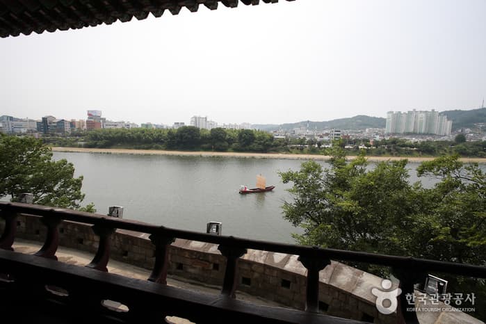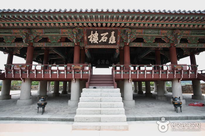 Although the structure was burnt down during the Korean War, it was restored in 1960 through the efforts of the Jinju Historical Site Preservation Society. The roof design features a mix of hipped and gabled styles and the stone pillars were built with rocks collected from Chokseoksan Mountain, located in Changwon-si. The wood used for the structure was brought from Odaesan Mountain, situated in Gangwon-do. Noticeable features of Chokseongnu are the four engraved signboards and a board that holds the works of renowned poets and calligraphers. Jinju Namgang Yudeung (Lantern) Festival is held every fall at the Jinjuseong Fortress.