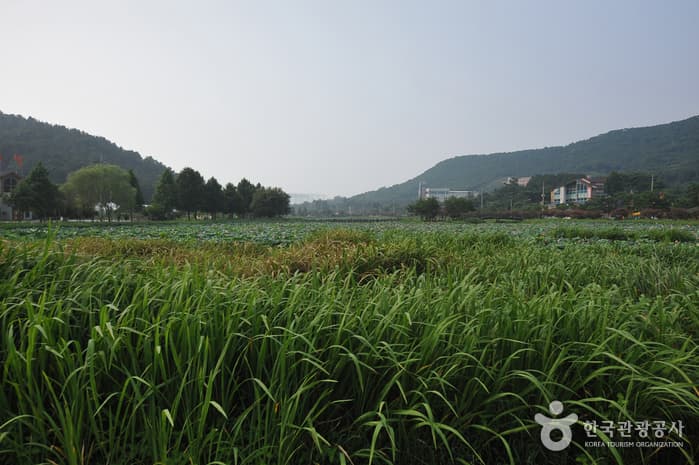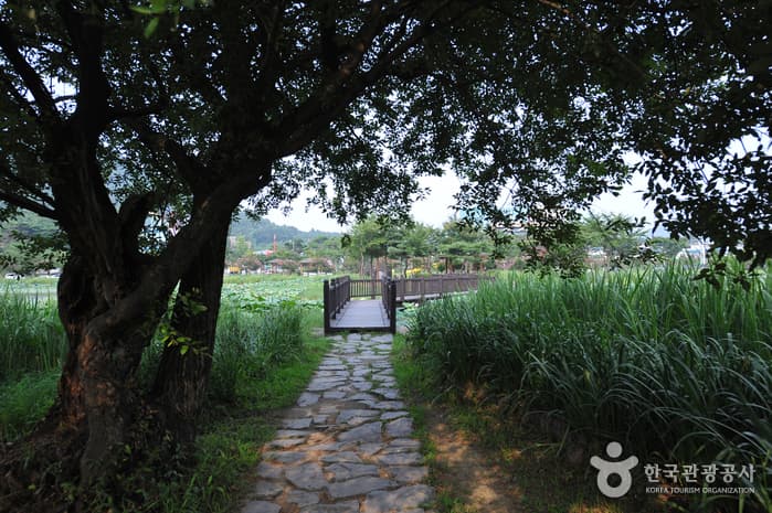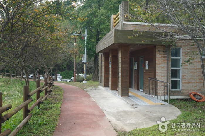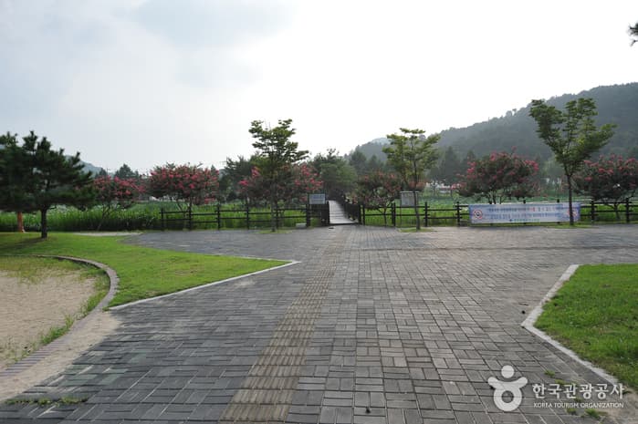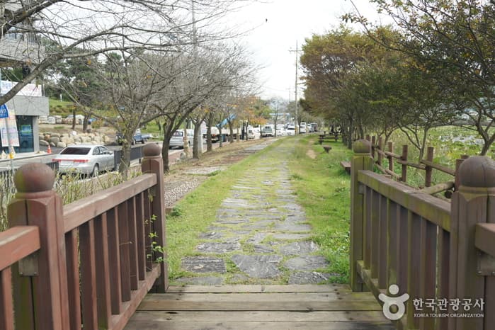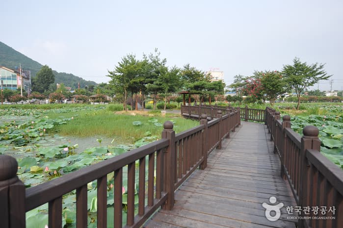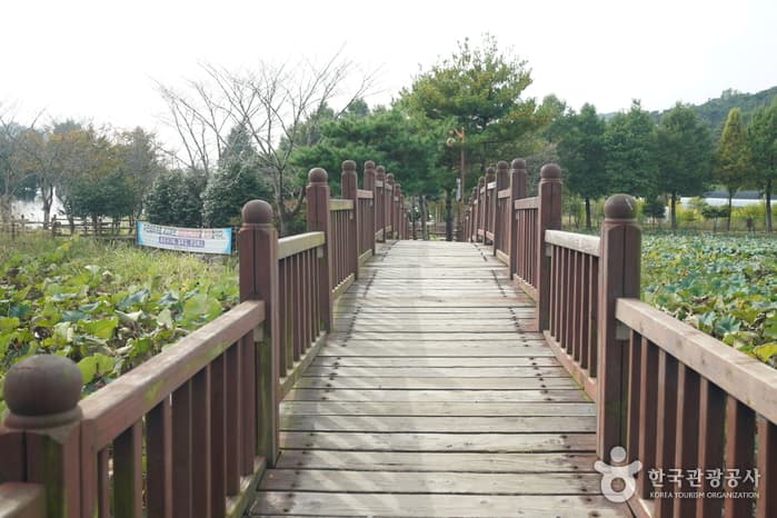 Jeonpyeongje Reservoir was built in 1943 to supply water for agricultural purposes to farms in the Maewol-dong and Byeokjin-dong regions as well as to prevent both floods and droughts. Starting in 1999, the reservoir was changed to a rest area, with a wooden deck crossing the reservoir to the man-made island in the middle. The area now serves as a waterside relaxation and eco-exploration space for family visitors.