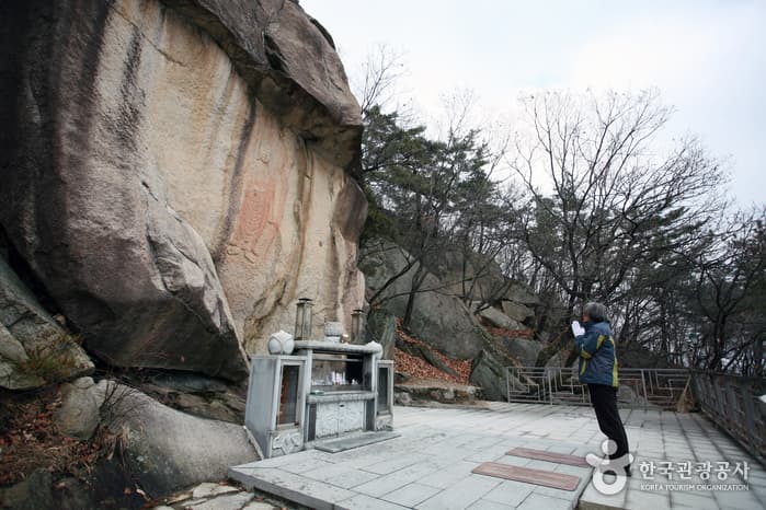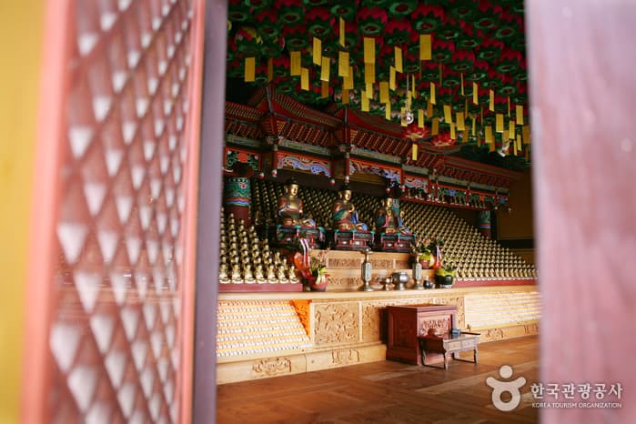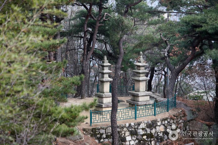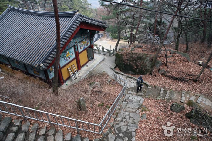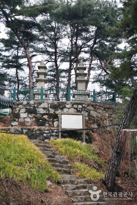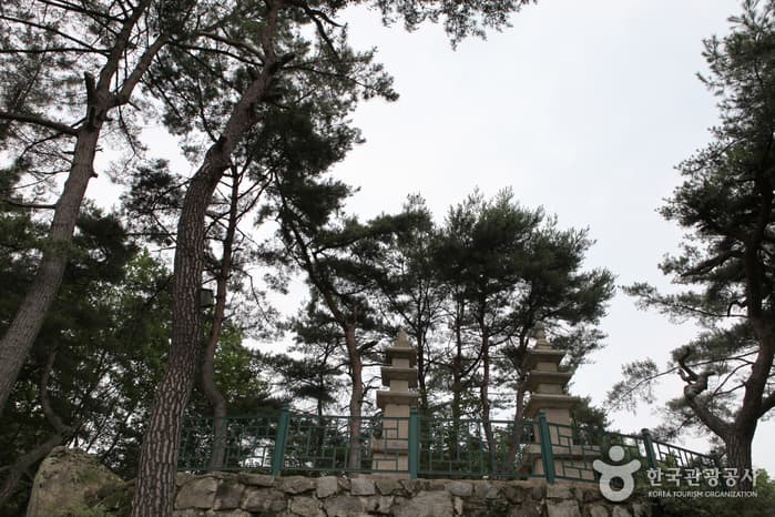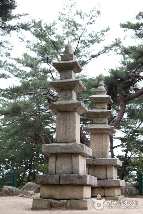 Yongamsa Temple, located in the mid-slope of Jangyongsan Mountain, is a branch of Beopjusa Temple. It was built during the Silla period. Unlike the more common temple arrangements, the stone pagoda in Yongamsa is uniquely situated on a low peak in the north with a view on all sides. The East and West Three-story Stone Pagodas of Yongamsa Temple, a designated Treasure, can be found here, as well as Rock-caved Buddha, and Wooden Seated Amitabha Buddha in Daeseongjeon Hall.