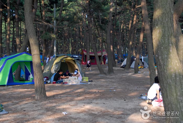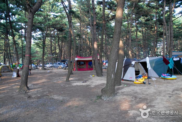 The beach is surrounded by a dense forest of pine trees. The pine tree forest along the beach serves as a good auto-camping location to enjoy some fresh air and the natural beauty of the surroundings. During low tide, the muddy sediments deposited by the tide provide a place where people come to catch clams and mud crabs or as a field trip for children to learn the mudflat ecosystem.