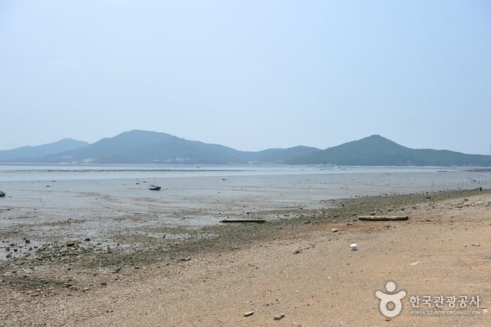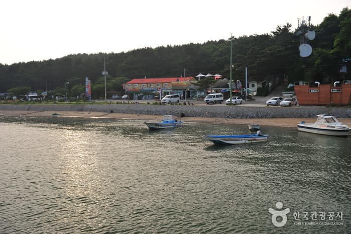 Although Geojampo beach is on the west coast, the estuary is facing the east allowing for a great view of the sunset and sunrise. The nearby Maedo Island is also called Sharkseom Island because it creates the shape of a shark's fin. The sunlight along the ocean creates a beautiful view during sunrise and sunset. The beach is lined with pine trees and has white sand, making it a popular family vacation destination. There are plans to develop the area to an international vacation destination.