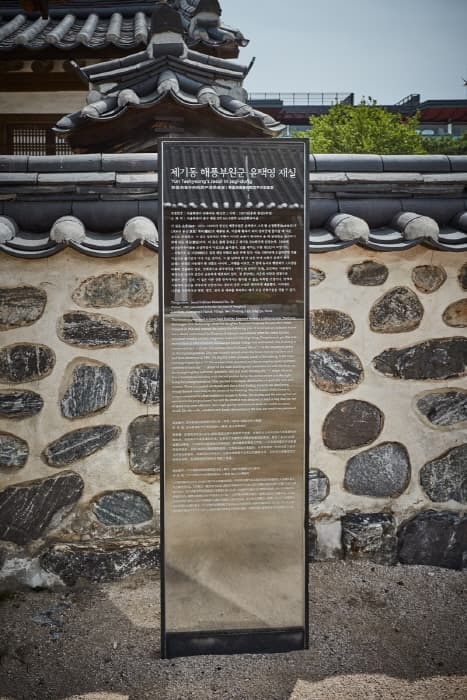 Haepungbuwongun Yun Taekyeong's Jaesil is a shrine house built by the father-in-law of King Sunjong of Joseon dynasty in 1906 when his daughter was proclaimed the crowned princess of Joseon and entered Changdeokgung Palace to later become Queen Sunjeong. Red pine trees salvaged from the demolition of Gyeongungung Palace were used to construct the house. It was originally located in Jegi-dong, Dongdaemun-gu, but was later restored and moved to its present location. The shrine of the house that was destroyed in 1960 was also restored.