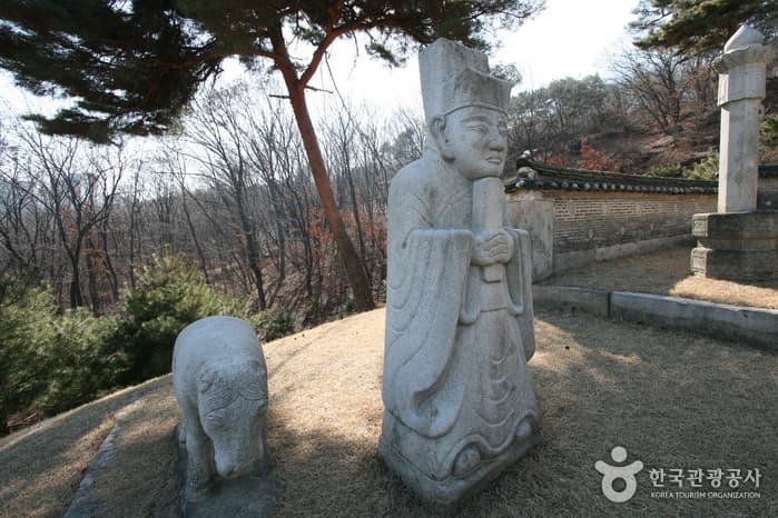 Jeongneung Royal Tomb is the tomb of Queen Sindeok, the second wife of King Taejo (1392-1398), founder of the Joseon dynasty (1392-1910). The queen met a sudden death due to health complications. Although one of her sons was the crown prince, he was killed by a successive brother, Yi Bang-won, in order to obtain the throne. After Yi Bang-won rose to the throne as King Taejong, he relocated Queen Sindeok's tomb to outside of the city walls.