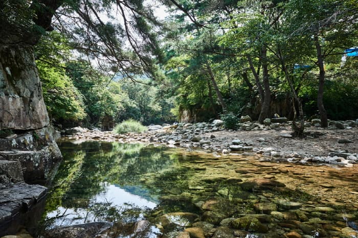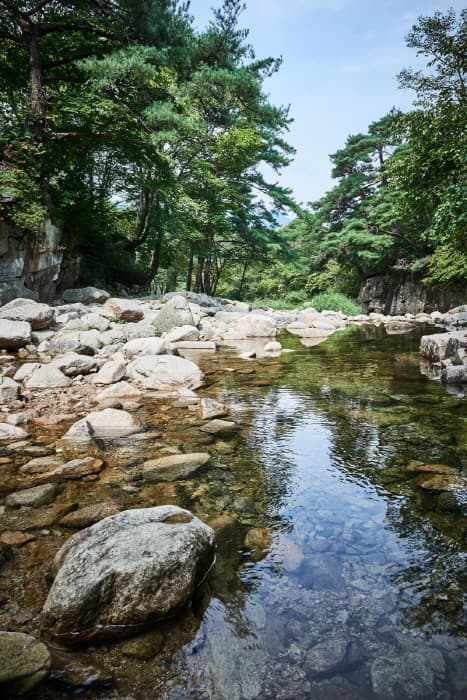 The first valley, Holongso, flows into a swamp area with many old pine trees nearby creating a picturesque view. The second valley is called Sogeumgang and it is said that its appearance changes with every season. Tteokbawi (rice cake rock) Valley gets its name from the shape it takes on, which is like a sliced rice cake. Similar to the first valley, Munsuam Valley, the fourth valley also has water flowing over uniquely shaped rocks with many old pine trees and flora. The fifth valley has quite a view of parallel rocks on both sides, while the sixth valley offers magnificent vistas of water flowing into a pool formed by the rocks. The water cascading down a huge boulder is said to look like the pleats of a woman’s skirt unfolding at the seventh valley. The eighth valley gathers water into a pond shape from the waterfall; legend says that fairies bathe here. The ninth valley is wide and refreshingly cool even during the hottest summer months.