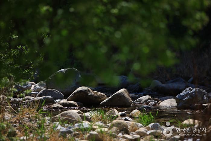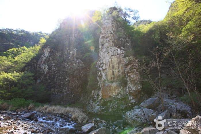 The valley is surrounded by Bobaesan Mountain, Gunjasan Mountain and Bihaksan Mountain and clear water flows all year down the walls of a series of unique rock formations.