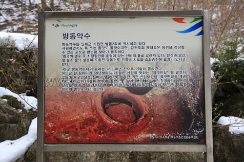 According to legend, there lived a simmani (ginseng digger) 300 years ago who, one day, dug a 60-year old wild ginseng in Bangdong-ri. Called yukgumandal, the ginseng was known to have been a great medicine of mystery. From the spot where the ginseng was dug came a mineral spring, which became today’s Bangdong Mineral Spring. The mineral spring has continued to attract people since the first day the ginseng was found and people who have drunk its water are said to have experienced various beneficial effects.