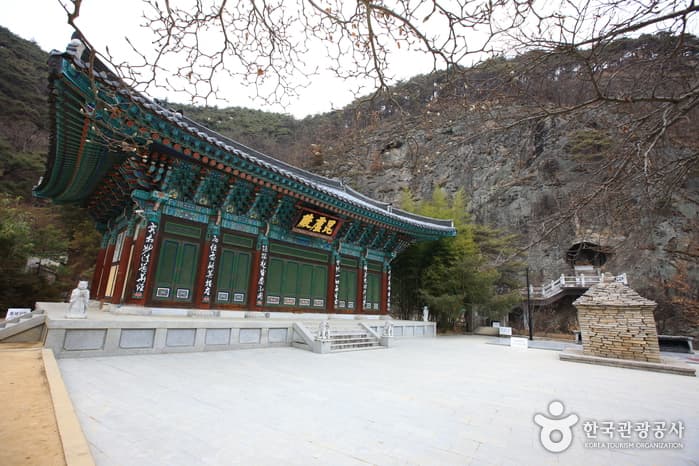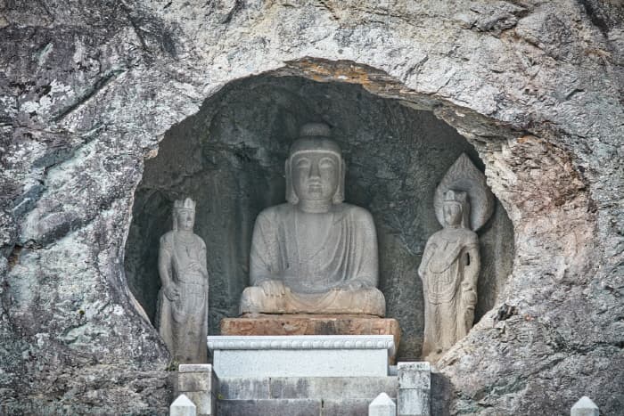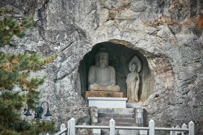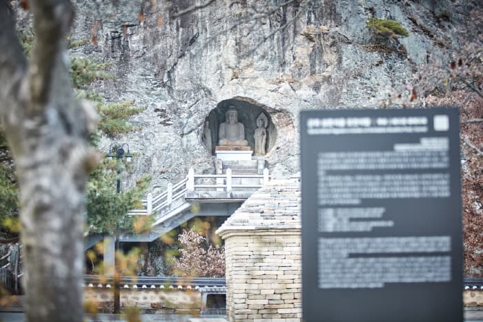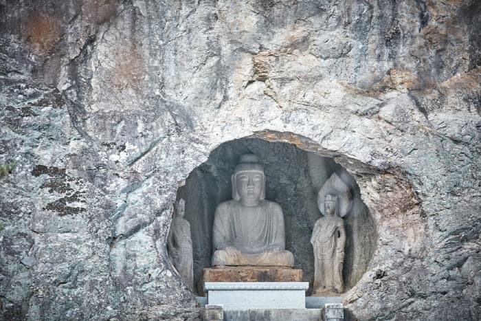 At the Hantijae Peak of Palgongsan Mountain in Daegu, is the Gunwi Buddha Triad Grotto, referred to as "the 2nd Seokguram Grotto". This grotto, designated as a National Treasure, is a natural cave on a sheer cliff. There is the beautiful Amitabul Buddha, the Bodhisattva of Power and the Bodhisattva of Compassion. The cave is 4.25 meters wide and 4.3 meters long, and is located 20 meters above the ground. This grotto is the progenitor of the Gyeongju Seokgulam Grotto, preceding the construction of Seokguram grotto by 100 years. It has been designated as a world cultural heritage.