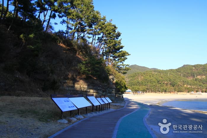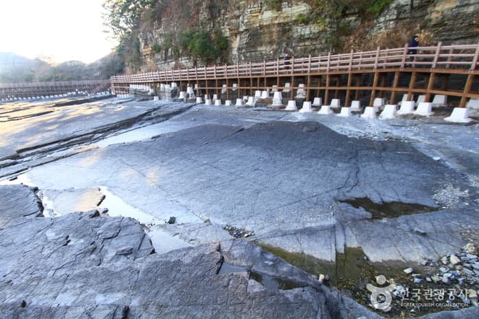 The ancient fossil site at Deokmyeong-ri, Goseong-gun, is one of the largest Cretaceous dinosaur fossils sites in the world. It is the home of a vast amount of footprints from a variety of ancient species, as well as the largest Mesozoic bird footprint found to date. The formations from many different prehistoric eras make it a precious site for academic research on the life patterns of dinosaurs, the ancient natural environment and formations, the distribution of sea and land, and the evolution of bird species. It is also a great tourist attraction that offers magnificent scenery, including a coastline dotted with beautiful Hallyeosudo islets, unique rock formations and cliffs, and sea caves.