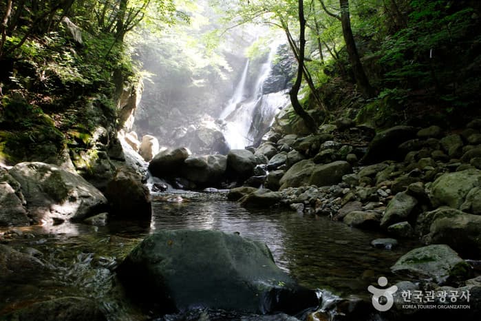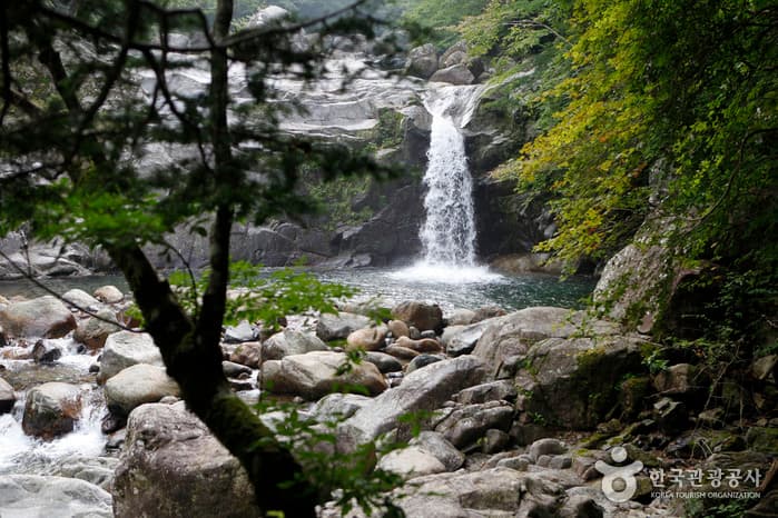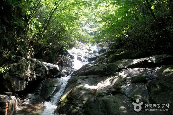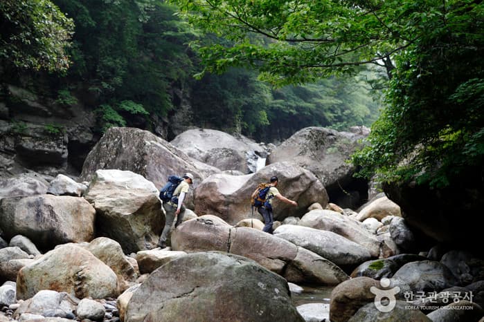 Chilseongyegok Valley is the most beautiful valley in Jirisan Mountain, and is one of the top three valleys in the nation, along with Cheonbuldonggyegok Valley in Seoraksan Mountain and Tamnagyegok Valley in Hallasan Mountain. The 16-kilometer valley stretching from Uitan of Macheon-myeon to Cheonwangbong Peak is characterized by very tough topography but beautiful scenery and is the only remaining primeval forest of Jirisan Mountain. It is also dotted with seven waterfalls and 33 ponds. The hike becomes more difficult as the trail enters the valley. Because the valley has taken many lives, some people call it "The Valley of Death." For that reason, visitors must apply in advance and hike with a guide. The trail in Chilseon Valley is a 9.4-kilometer course from Chuseong Village in Macheon-myeon to Cheonwangbong Peak, which does not follow the natural valley, due to the valley's steep and dangerous features. Starting from Chuseong Village, the trail passes Yongso Pond, Jujiteo Site, Chuseongmang Rock, Seonnyeotang Pond, Ongnyeotang Pond, Biseondam, Chilseonpokpo Falls, Daeryukpokpo Falls, Samcheungpokpo Falls and Mapokpo Falls, all before reaching Cheonwangbong Peak.
